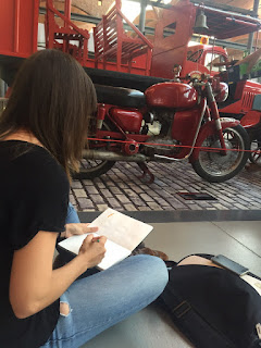 En tercer lugar, el encuentro duró, esta vez, hasta las 13h. Y menos mal, porque dibujar a la Jenny (la máquina, no la persona) no es fácil. Así, invadimos el museo y nos repartimos desde la terraza (donde apretaba un calorazo que no cualquiera aguantaba) hasta el patio y la puerta de entrada, pasando por las exposiciones. Los temas elegidos fueron muy variados porque el museo invitaba a ellos: había desde aviones hasta laboratorios.